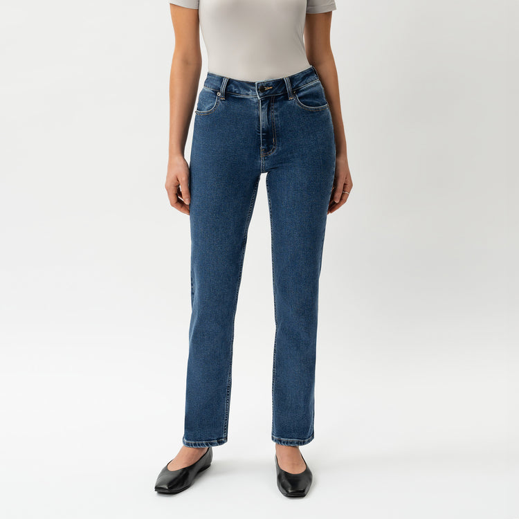 Erleben Sie den klassischen Look von Denim mit dem Komfort unglaublicher Dehnbarkeit. Unsere hoch taillierten Jeans mit geradem Bein sind aus einer firmeneigenen Denim-Mischung gefertigt, die sowohl sehr dehnbar als auch dick ist und das Gefühl von traditionellem Denim mit zusätzlicher Flexibilität vermittelt. Diese vielseitigen Jeans sind perfekt für den Alltag und ein Must-have in Ihrem Kleiderschrank.
