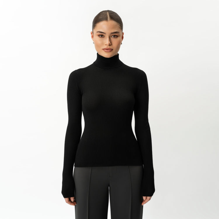 Ein wunderschöner, eleganter Rollkragenpullover aus feinem Strick, der sich dem Körper anpasst und die Figur sehr vorteilhaft betont.