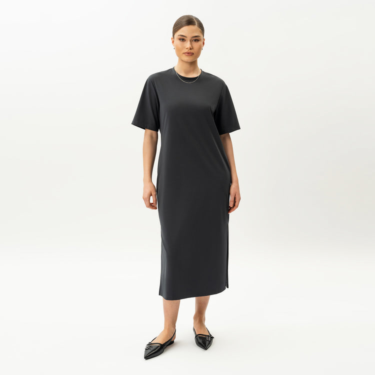 Dieses Kleid werden Sie immer wieder gerne tragen. Es ist aus einer weichen, atmungsaktiven Baumwollmischung gefertigt, hat eine lockere Passform mit dezenter Formgebung und Seitenschlitzen für mehr Bewegungsfreiheit. Es lässt sich sowohl elegant als auch leger kombinieren und ist ein vielseitiges Basic, das Komfort und Bequemlichkeit verspricht.